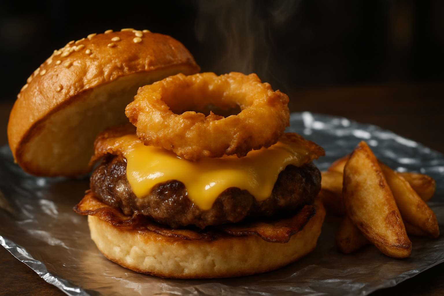 Doble Medallón de carne, cheddar, cebolla caramelizada, tocino, aros de cebolla, bbq